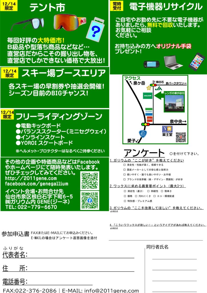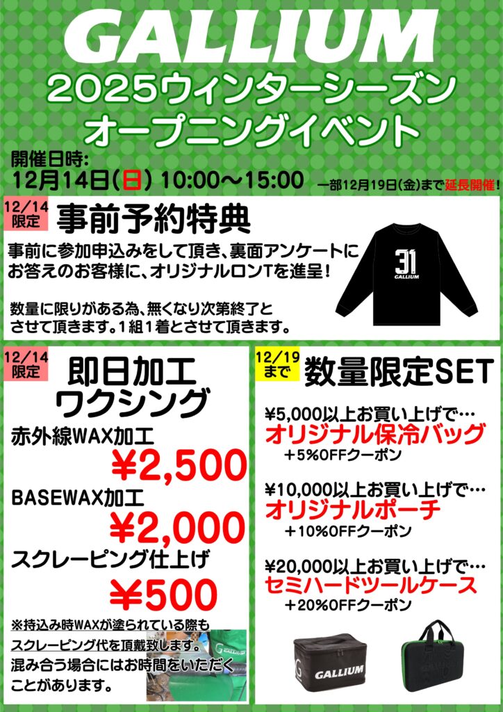 毎年ご好評いただいている、WAXの即日仕上げや、特価テント市をはじめ、スキー場早割チケットの販売、抽選会、フリーライディング体験ブース、電子機器リサイクル受付など、1日限りの特別企画が盛りだくさんです。
